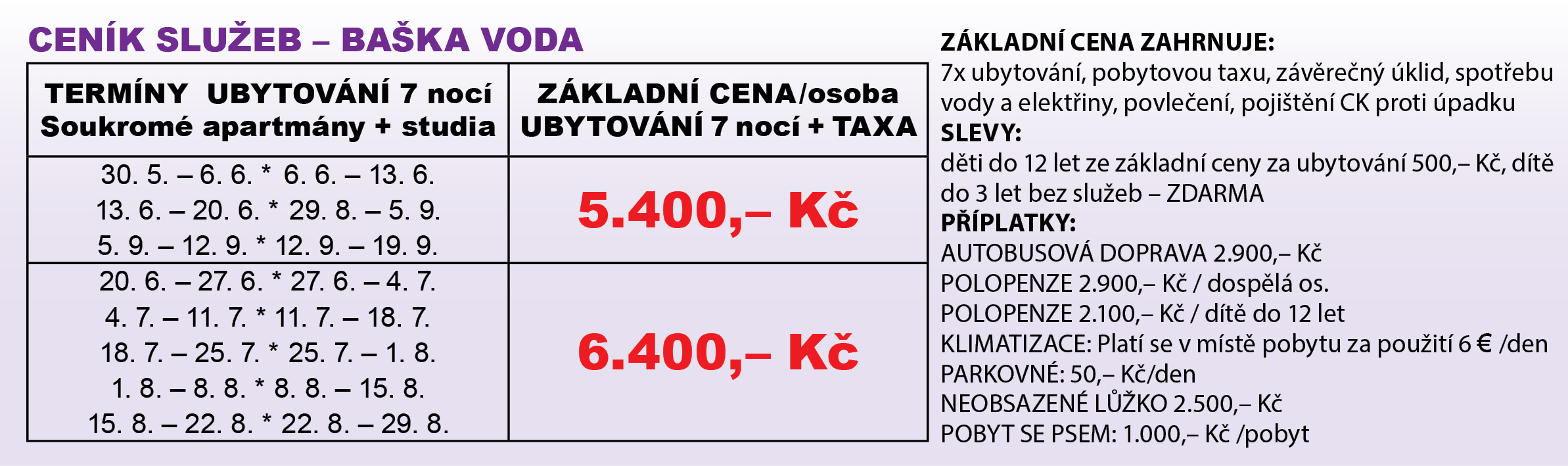 Nachází se v klidnější části letoviska Baška Voda. Vzdálenost od oblázkové pláže je 400 m a od centra 200 m. K ubytování nabízíme 2 lůžkové pokoje a prostorné 2 až 6 lůžkové, více ložnicové apartmány, vkusně zařízené, vždy s klimatizací, s balkonem a vlastní kuchyní s jídelním koutem a lednicí. Všechny pokoje a apartmány disponují vlastním sociálním zařízením se sprchovým koutem. Parkování zajištěno přímo u domu. Polopenze v Bašce Vodě se podává v restaurační jídelně nebo na venkovní, kryté terase v penzionu PALMA, který je vzdálený od ubytování 200 m. Servíruje se zde jednotná česká polopenze. Možnost zakoupení veškerého občerstvení.